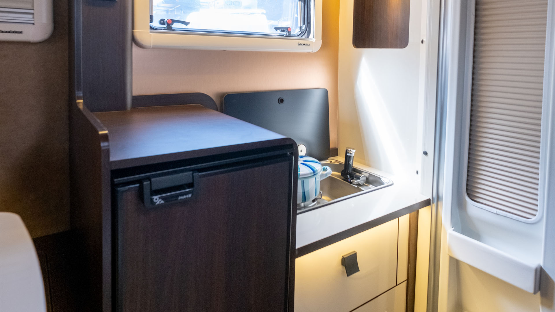 • Hervorragende Küchenausstattung, inklusive 90 L Kühlschrank und einem großen 2-Flammen-Herd.